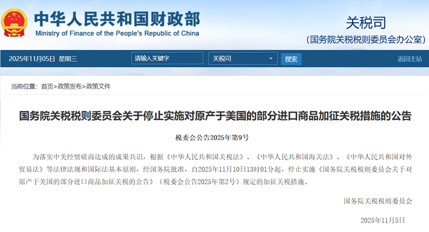•自2025年11月10日13时01分起,停止实施3月4日发布的《国务院关税税则委员会关于对原产于美国的部分进口商品加征关税的公告》(税委会公告2025年第2号)规定的加征关税措施。