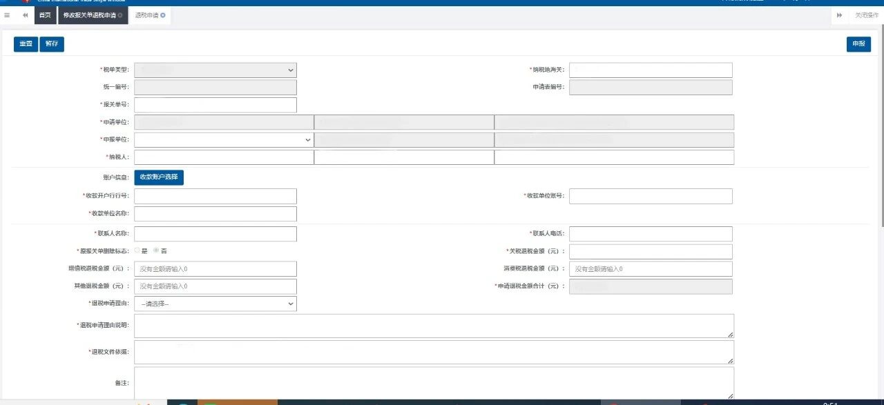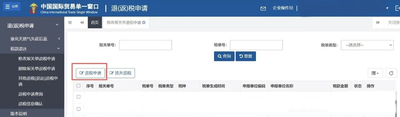 进入中国国际贸易单一窗口——口岸执法申报——税费办理——退税申请