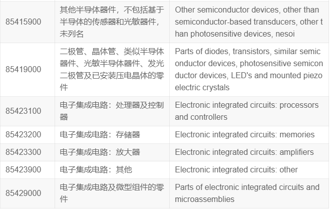 据美国贸易代表办公室(USTR)消息,2025年12月22日USTR发布通知:对中国的半导体相关产品征收301关税,初始附加关税税率为0%,自2027年6月23日起18个月内逐步提高税率,具体涉及的产品如下: