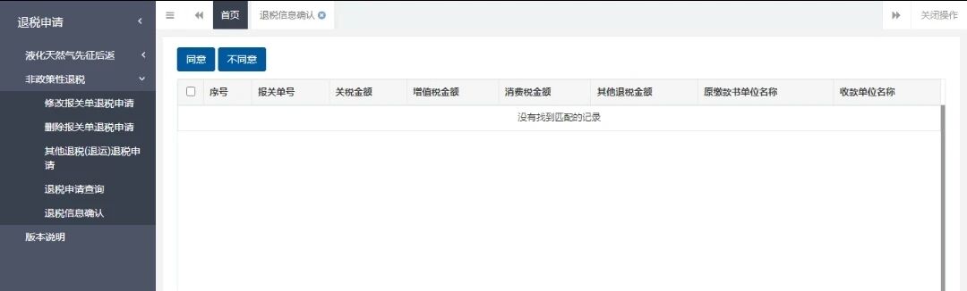 系统会向收发货人发送确认信息,退税申请查询列表状态列显示“发往收发货人确认”,收发货人登陆单窗进入退税信息确认,点击同意可生成退税申请发送海关,点击不同意则退回申报人界面。如下图。